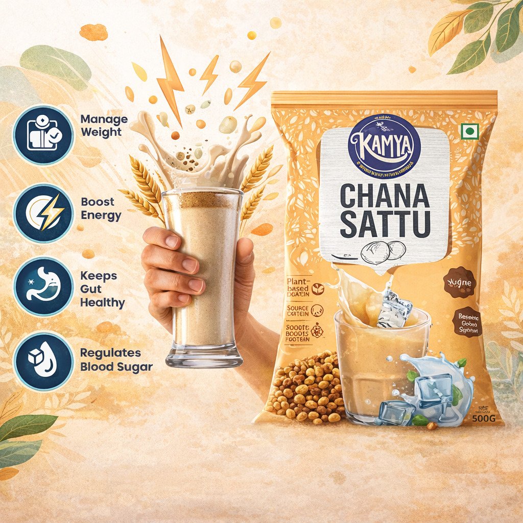 Kamya Chana Sattu is a nutritious and refreshing health drink made from premium roasted chana (gram). Packed with plant-based protein and dietary fiber, it is a wholesome traditional superfood perfect for daily energy and wellness.
