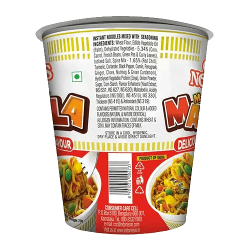 Wheat Flour, Edible Vegetable Oil (Palm), Iodised Salt, Dehydrated Vegetables – 4.14%, Carrot, French Bean, Green Pea, Curry Leaves), Iodised Salt, Spice Mix – 1.65% (Chilli, Turmeric, Coriander, Black Pepper, Cumin, Fenugreek, Ginger, Clove, Nutmeg & Green Cardamom), Hydrolysed Vegetable Protein (Soya), Onion, Sugar, Corn Starch, Flavour Enhancers (Yeast Extract, INS 631, INS 627, INS 620), Maltodextrin, Acidity Regulator INS 500i, INS 451 i, INS 330], Thickener INS 415, Antioxidant INS 319